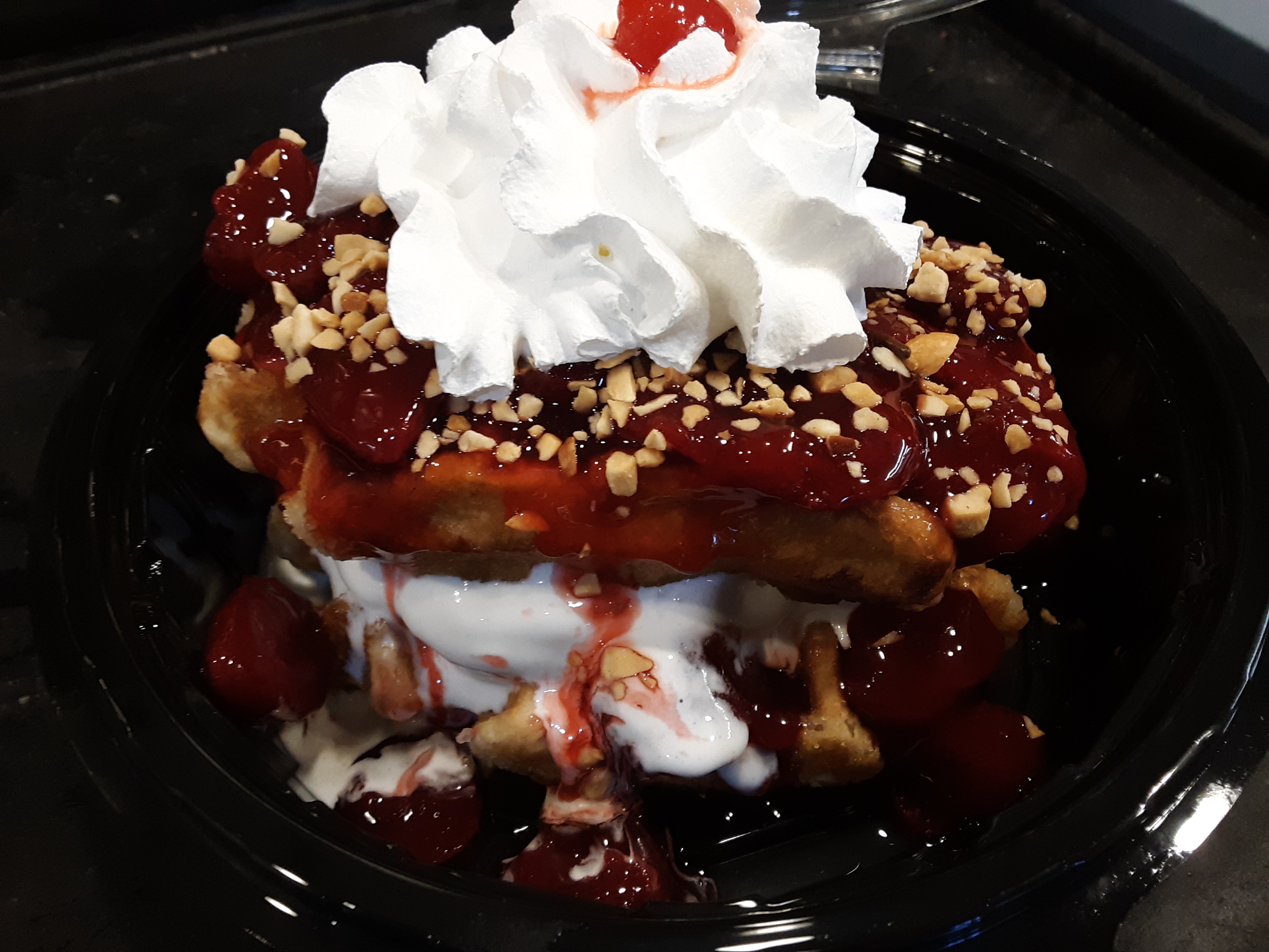 Creamy Vanilla ice cream between our homemade Belgian Waffle, strawberry topping, peanuts, whipped cream and a cherry on top!!
