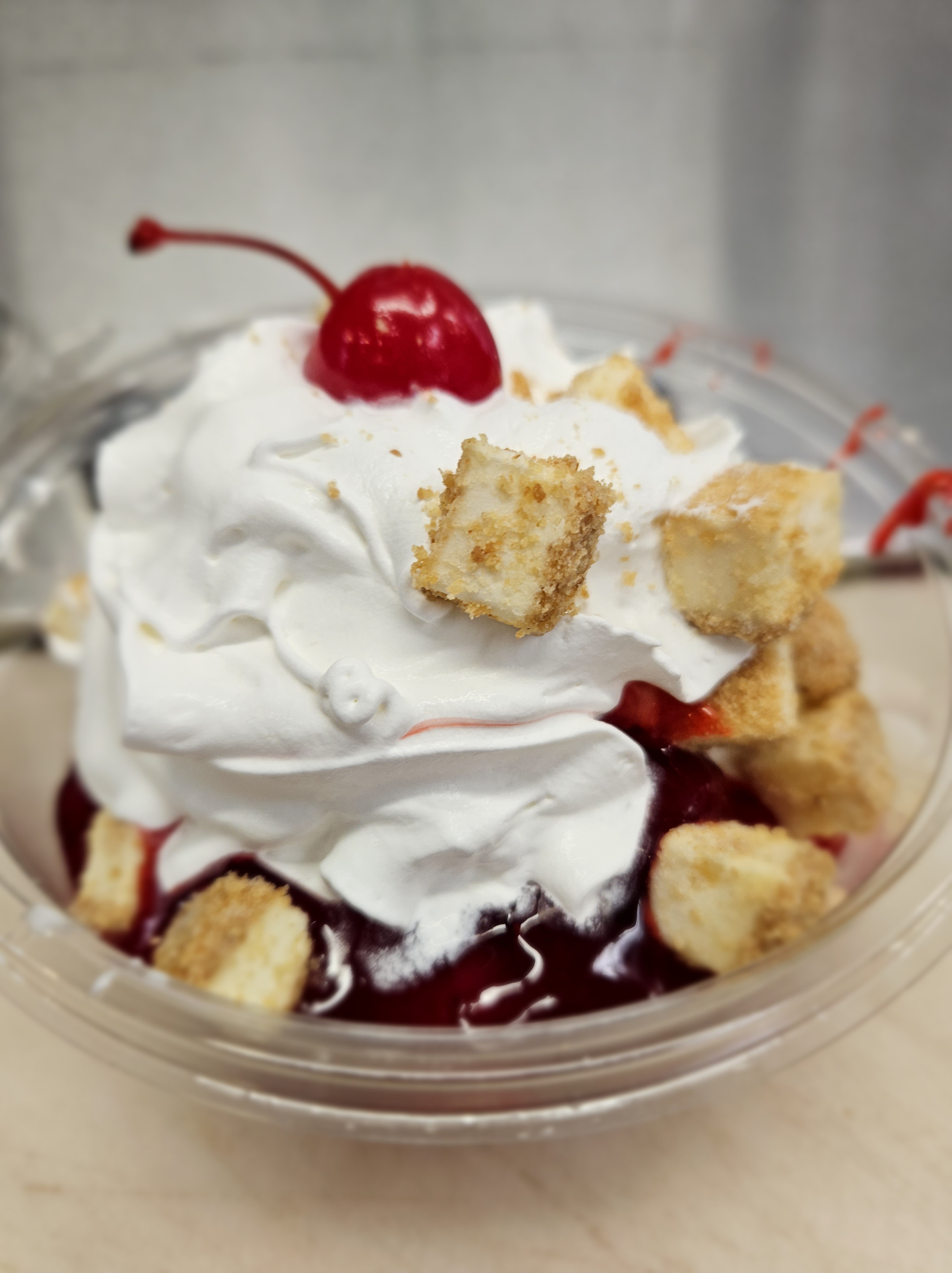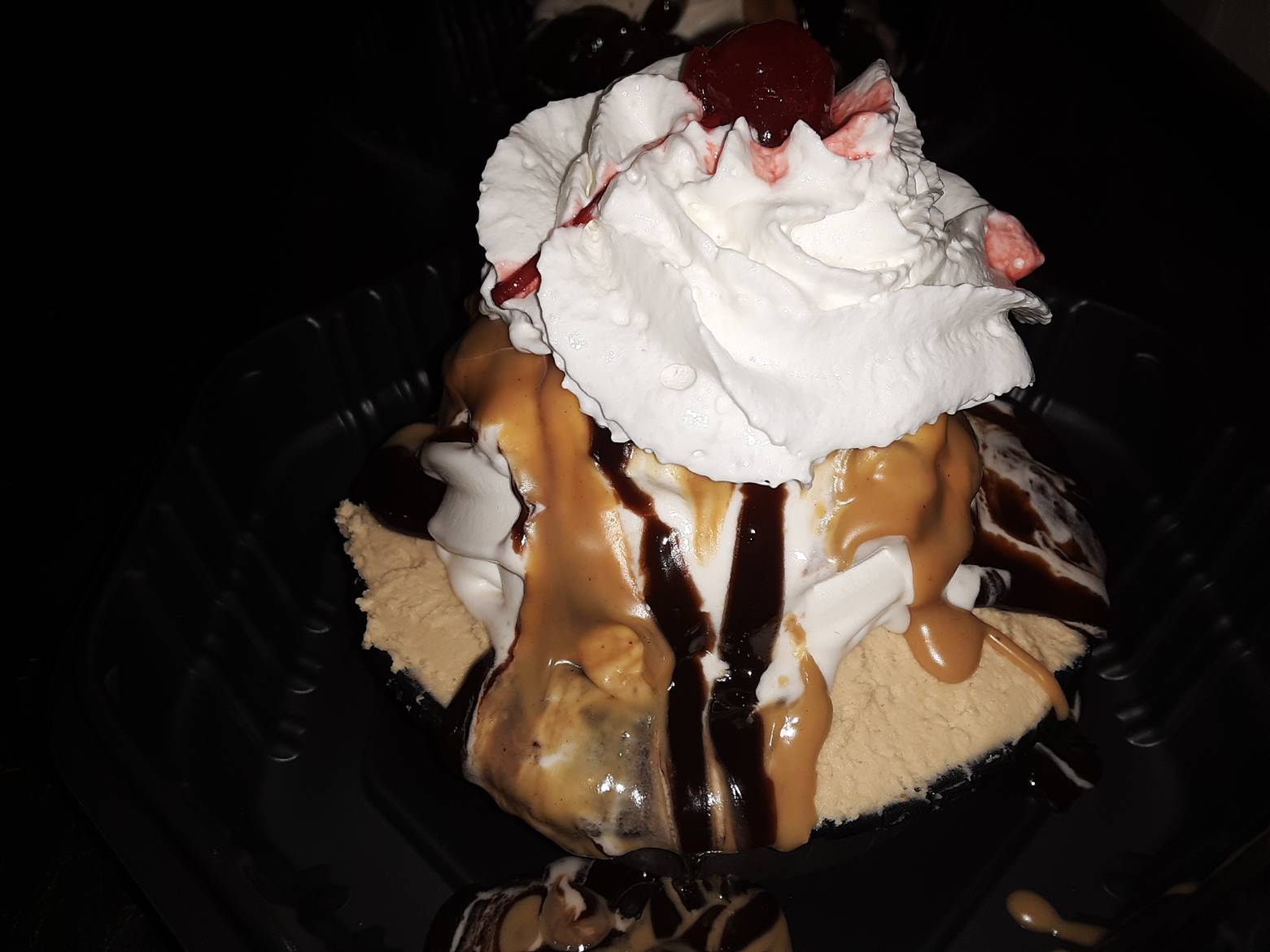 Served with Peanuts, Whipped Cream, and a Cherry on top.