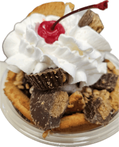 Ice cream TWIST, p-nut butter sauce, hot fudge & p-nuts served with our P-Nut Butter Bomb Cookie!!